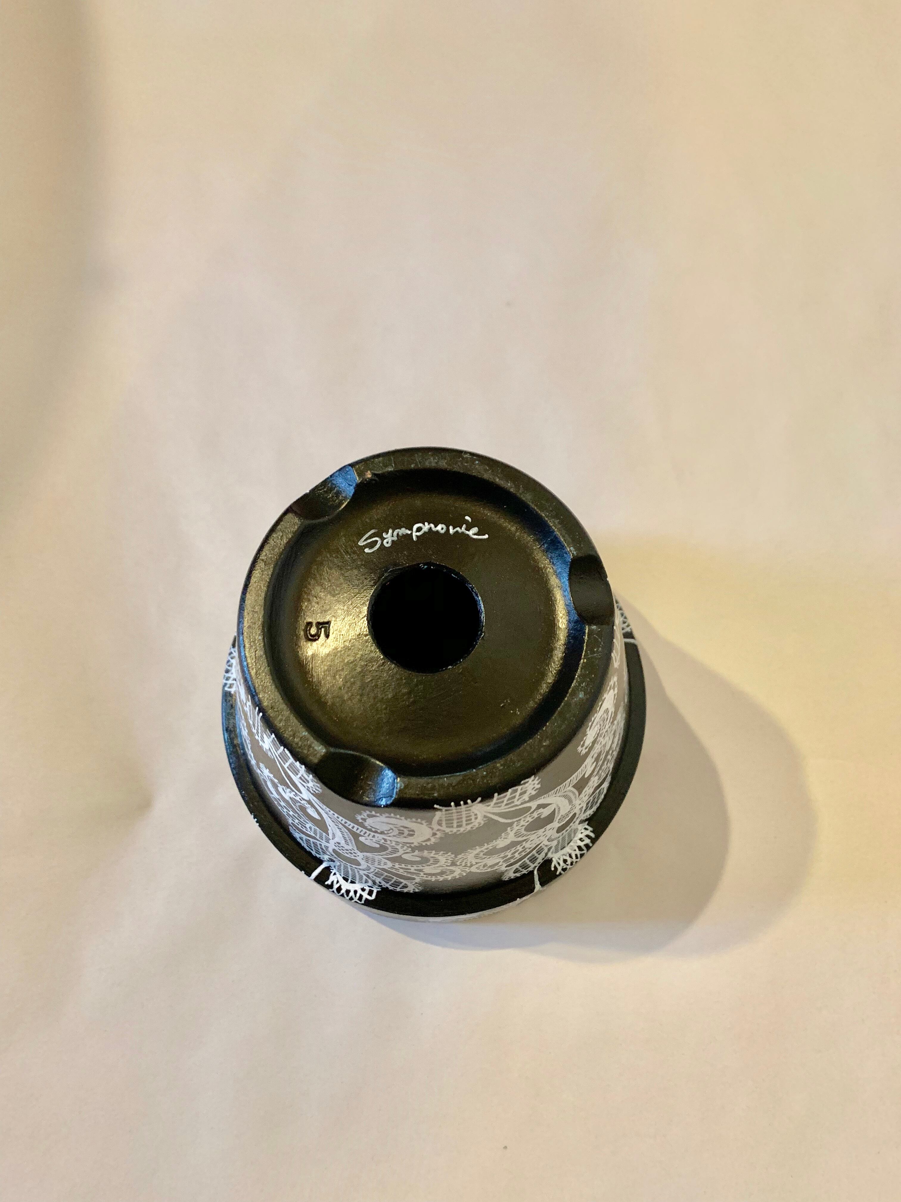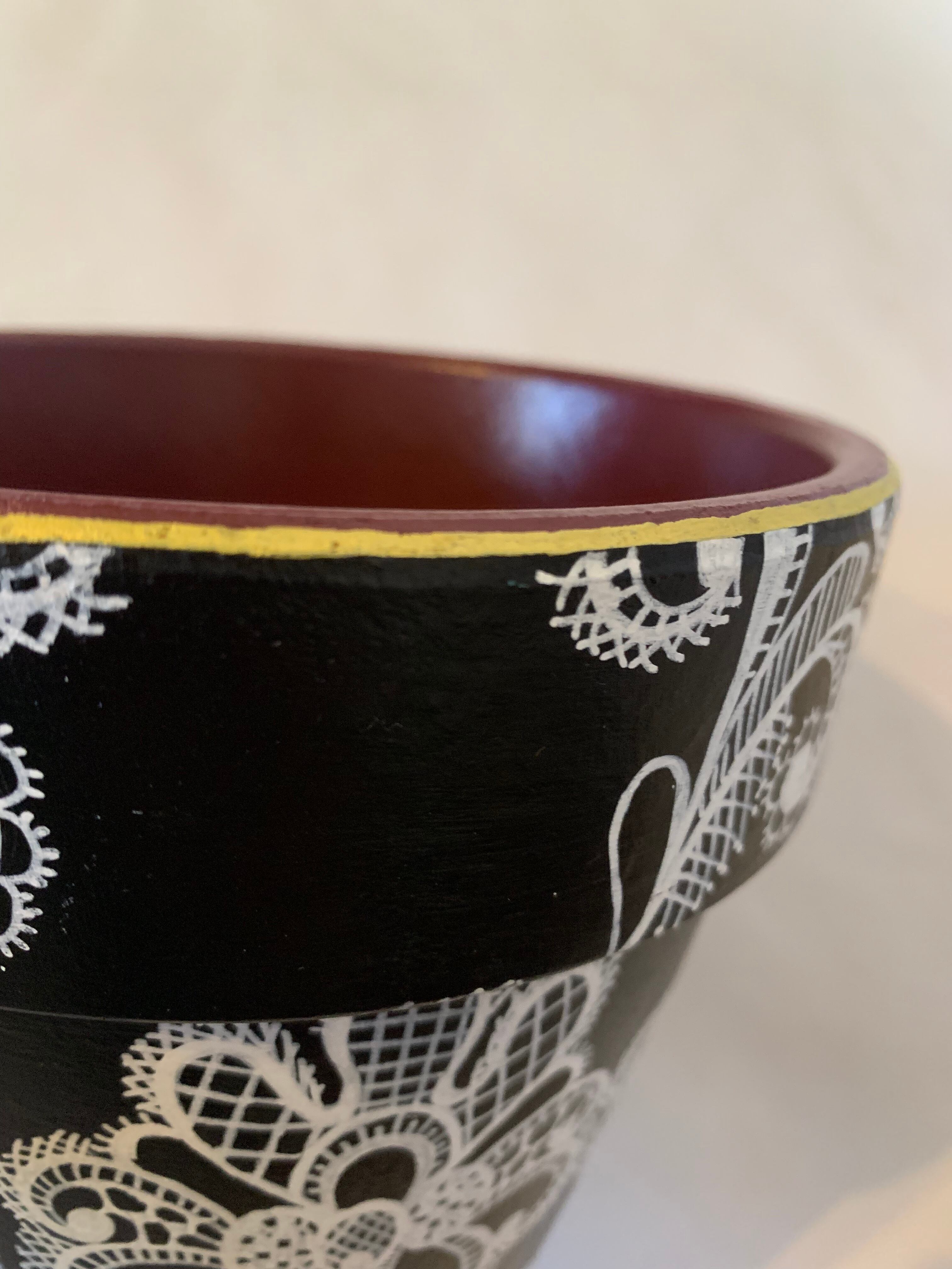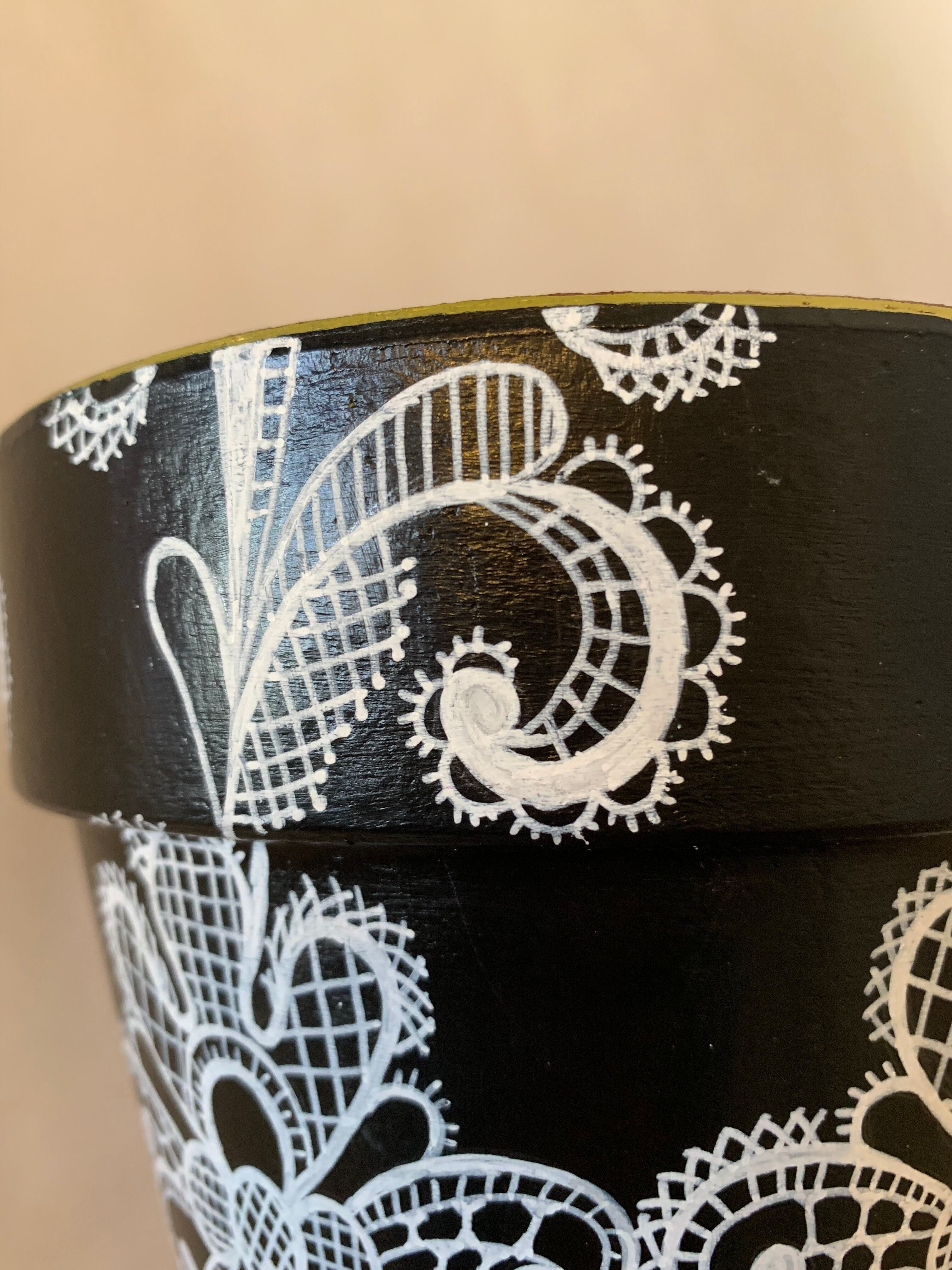 黒をベースに白のレース模様を描いています。トップにはアクセントでゴールドのライン入り。