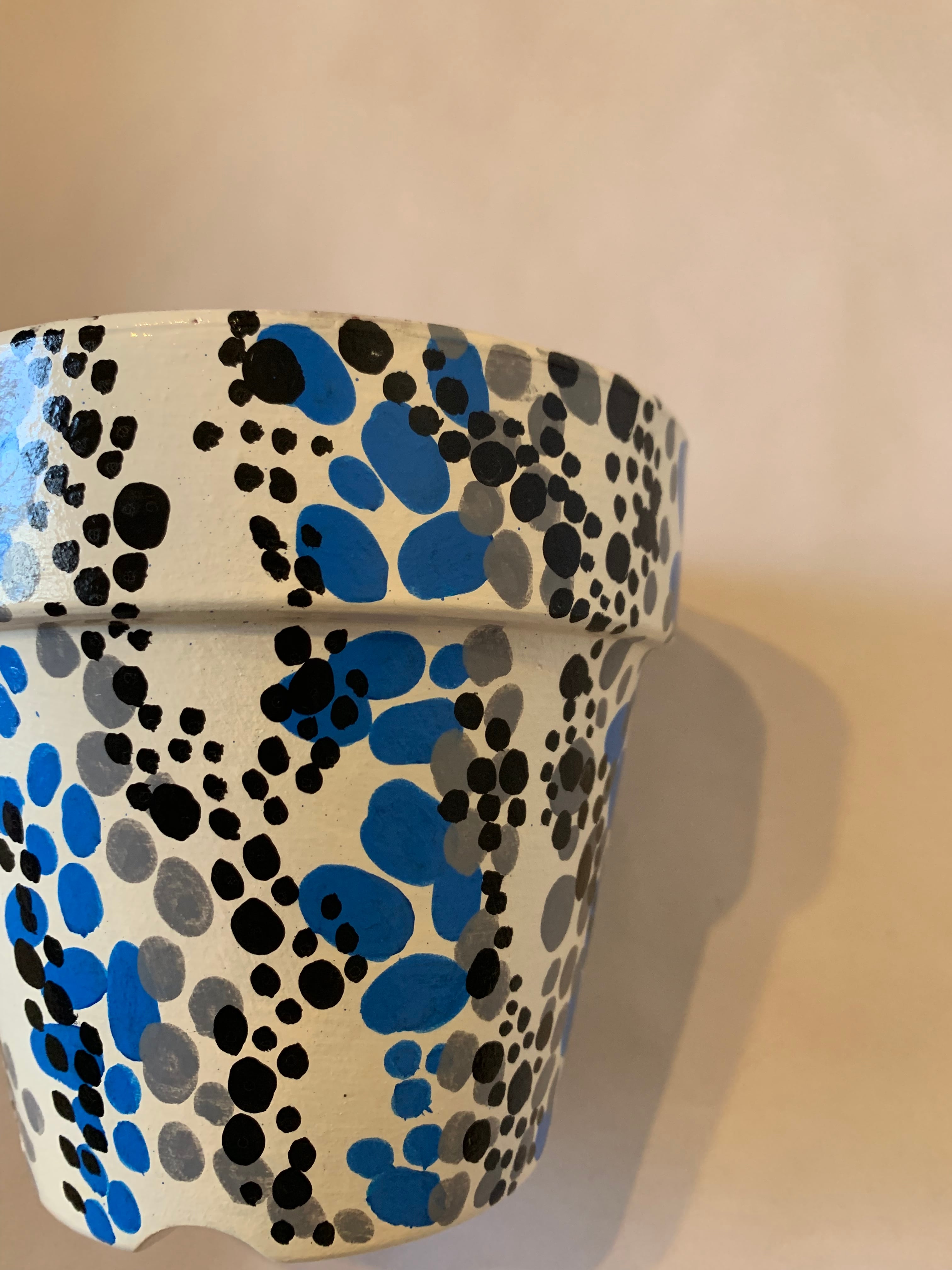 白をベースに水色、黒、グレーで水玉のストライプを描きました。内側は黒で仕上げています。