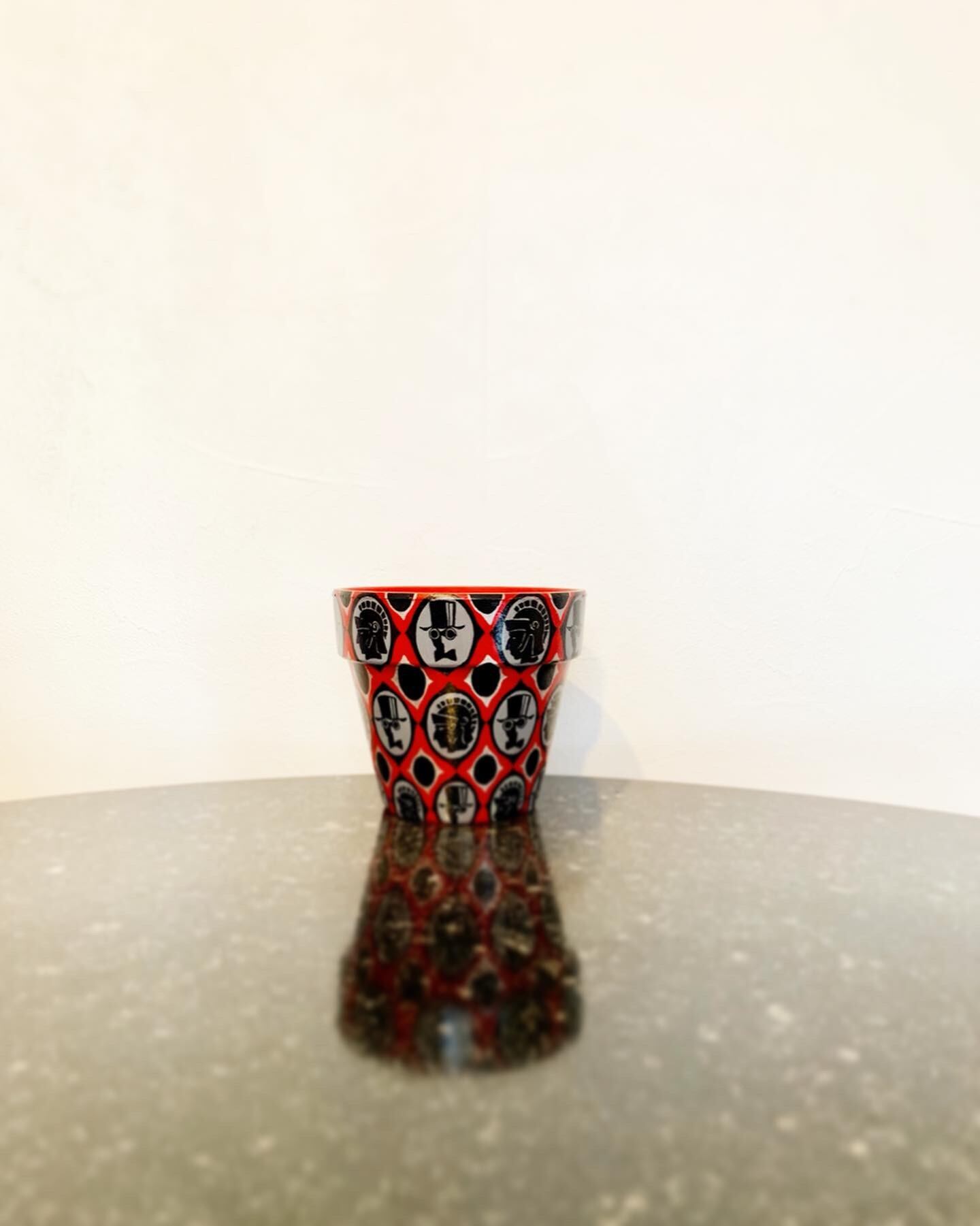 赤をベースにシルクハットとインディアンの男性をモチーフに描きました。内側も同じ赤を、ゴールドのラインでアクセントを入れています。
