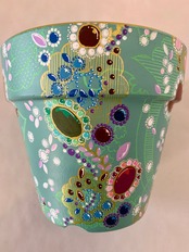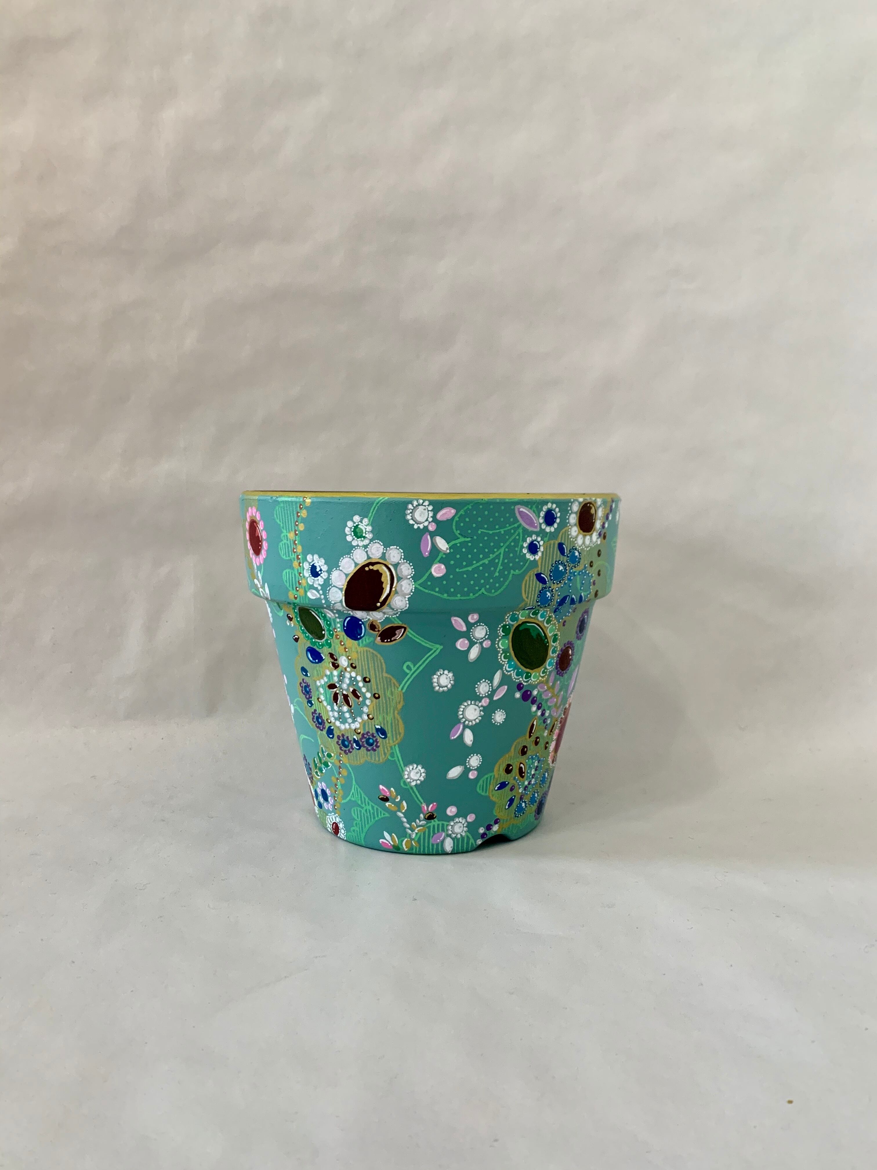 ライトグリーンで花柄を大きく描き、その上にゴールドで花のモチーフを、そして4つの流れているジュエルを描きました。
